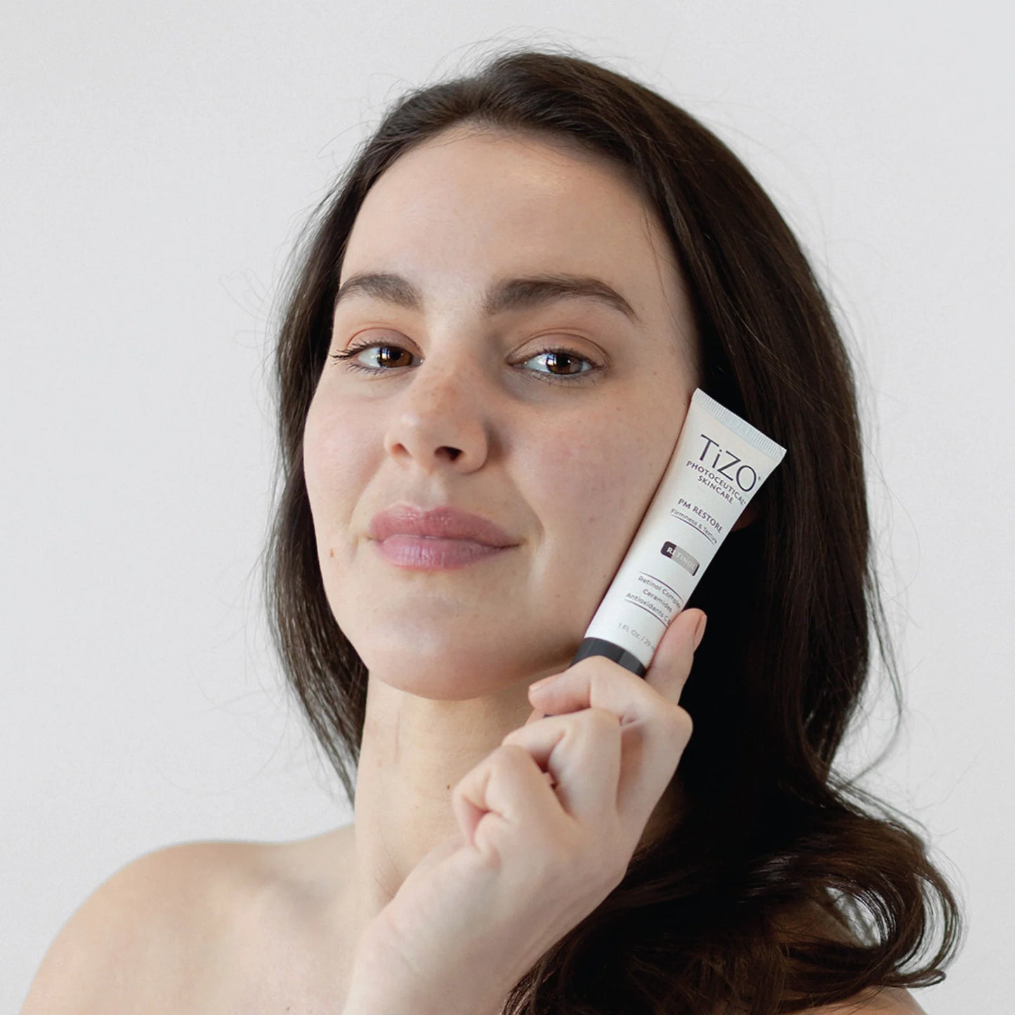 - Aplica una pequeña cantidad de TiZO Photoceutical PM Restore en el rostro y cuello, evitando el área de los ojos.