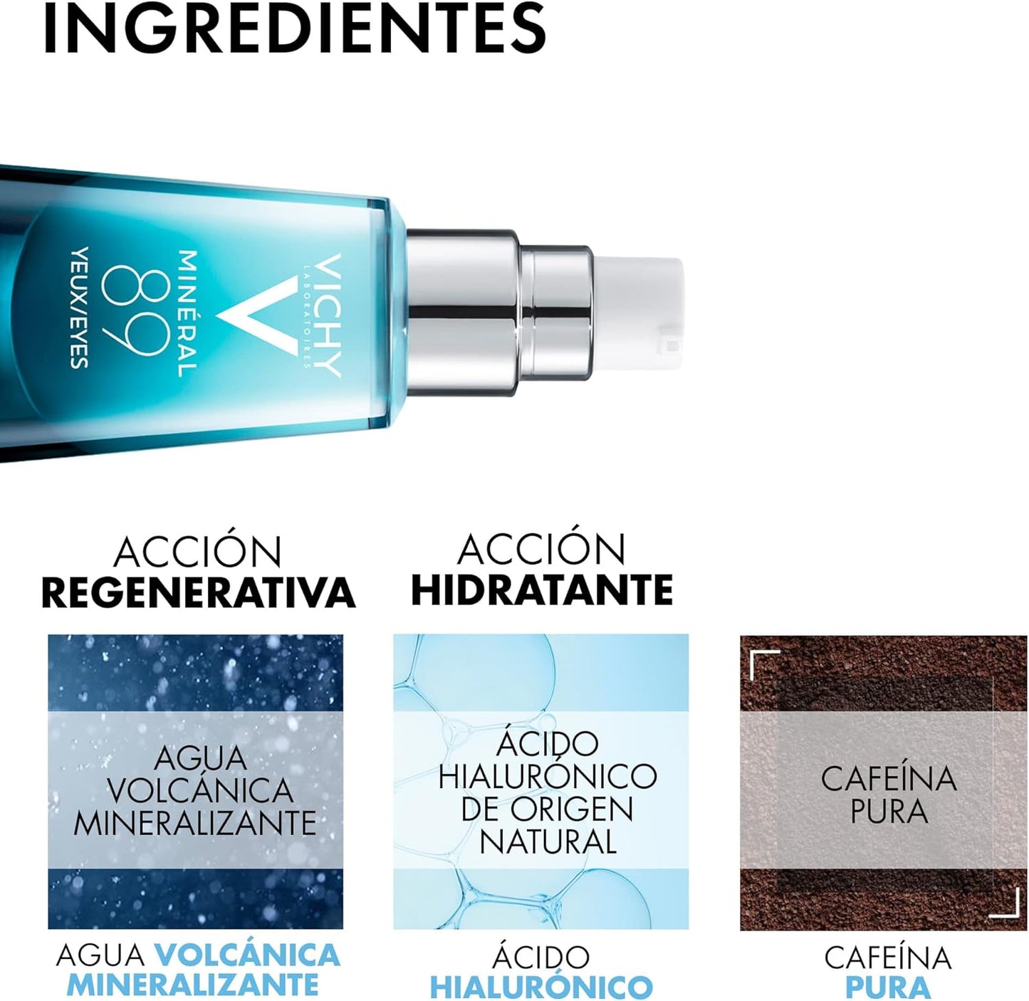 Vichy 89 Mineral Gel para Contorno de Ojos con Cafeína, Ácido Hialurónico y 89 % de Agua volcánica de Vichy. Hidrata, Ilumina y Suaviza las líneas finas de la delicada zona de los ojos. Mirada más luminosa y descansada. 15ml.