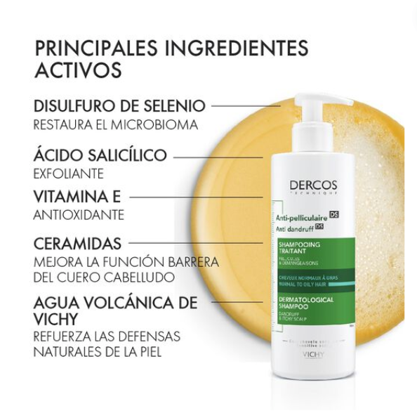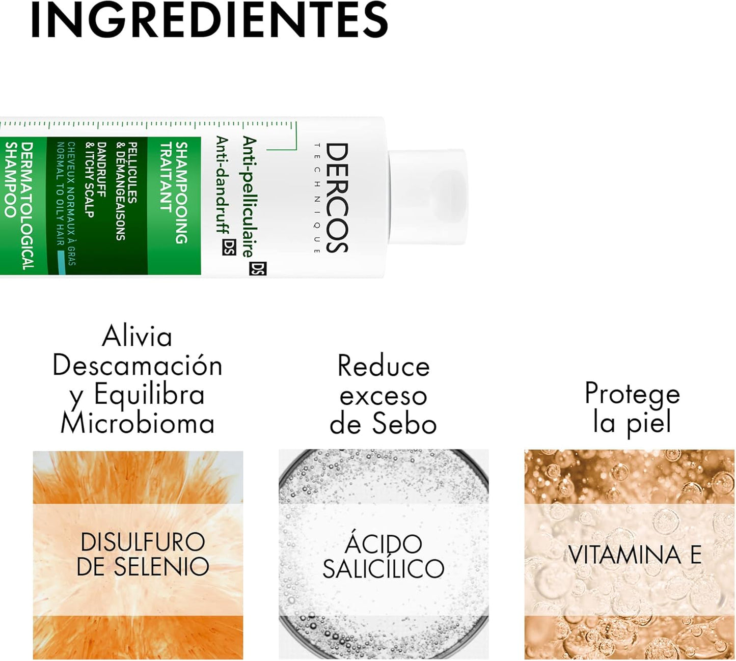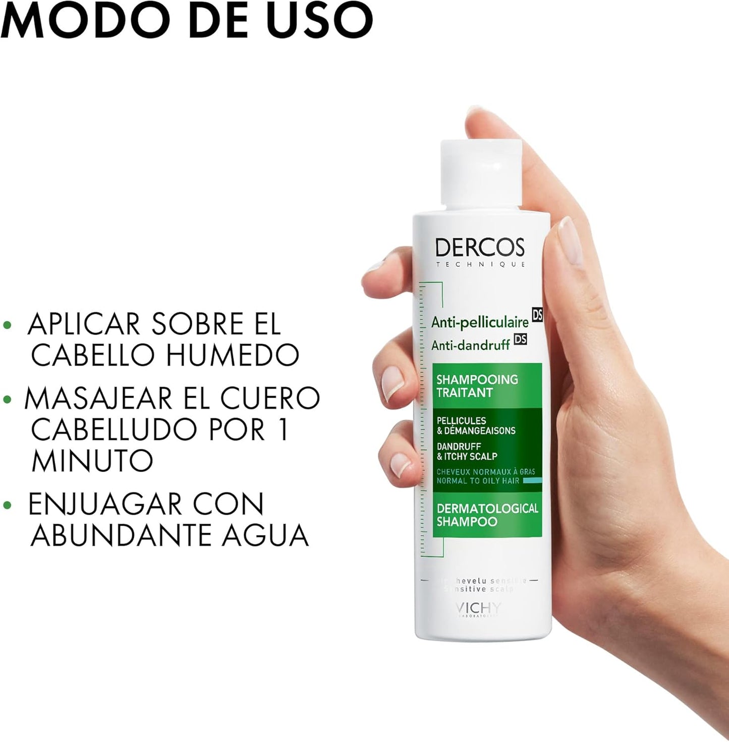 VICHY Dercos Anti-Caspa DS Shampoo Caspa Grasa combina ciencia dermatológica y eficacia comprobada para que disfrutes de un cabello limpio, fresco y libre de caspa visible.