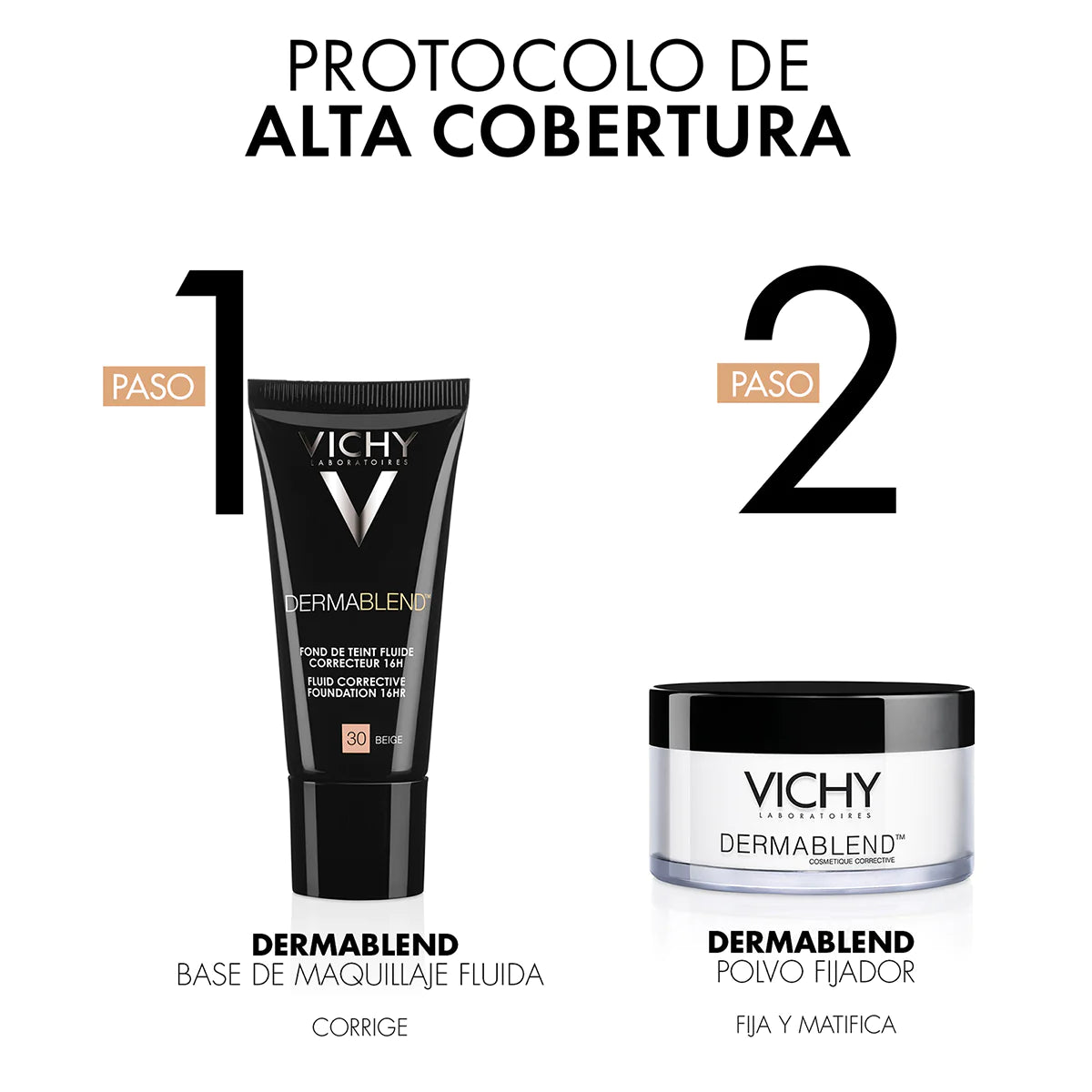 Utilice el polvo fijador Vichy Dermablend con los correctores de color Dermbalne, la base fluida y el corrector en barra SOS para obtener mejores resultados.