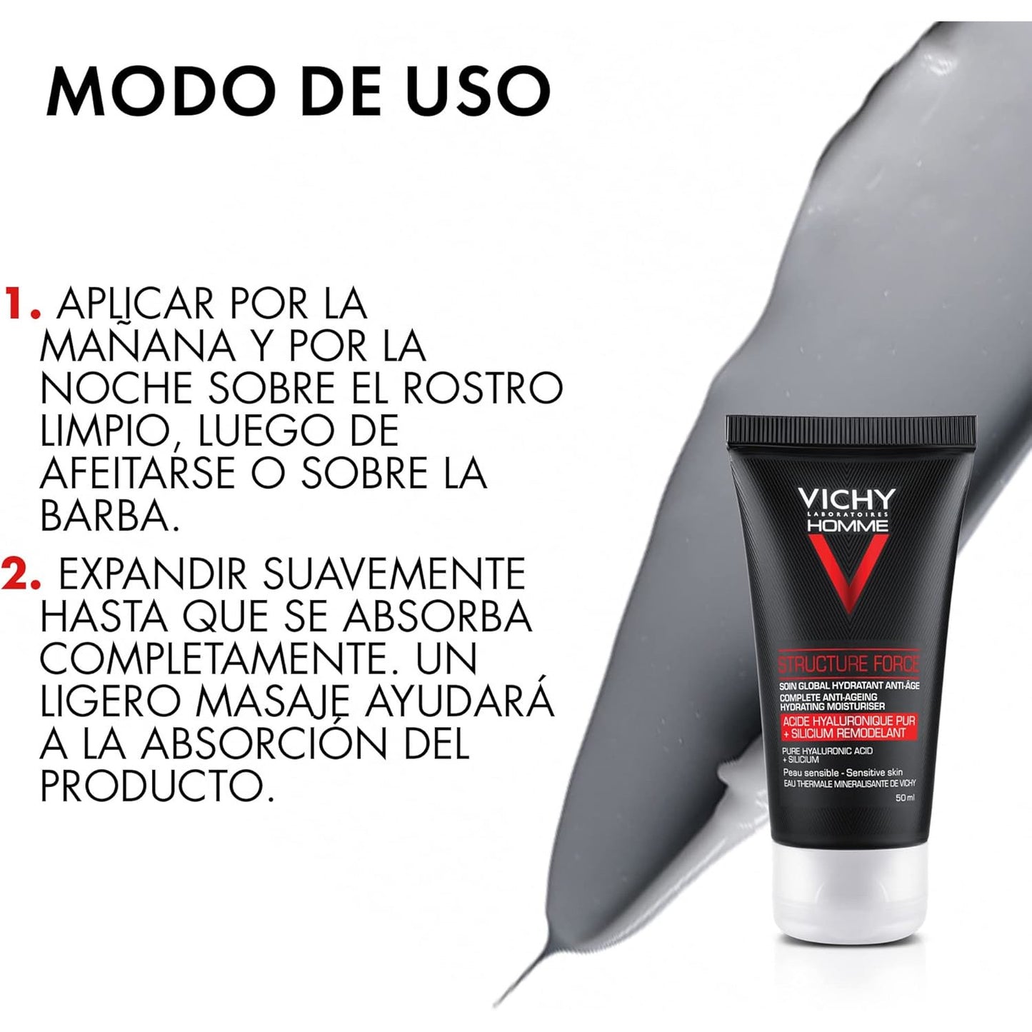 Para usar durante el día Vichy Homme Structure Force, seguir la hidratación con la aplicación de FPS.