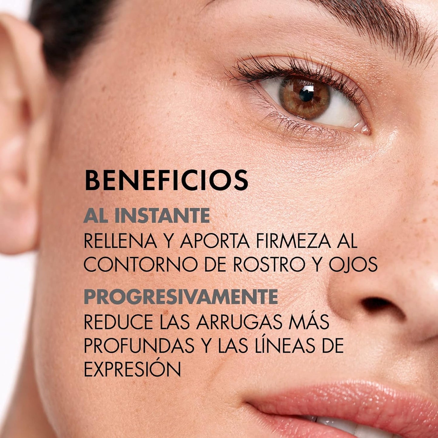 Rellena arrugas y líneas de expresión: Innovador sérum antiedad que combate las arrugas y la pérdida de densidad en el rostro y el contorno de los ojos. Reduce visiblemente los surcos, restaurando una piel firme y suave.